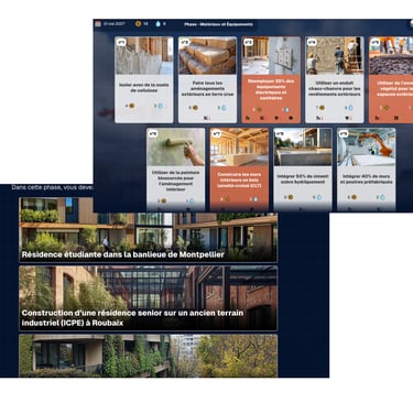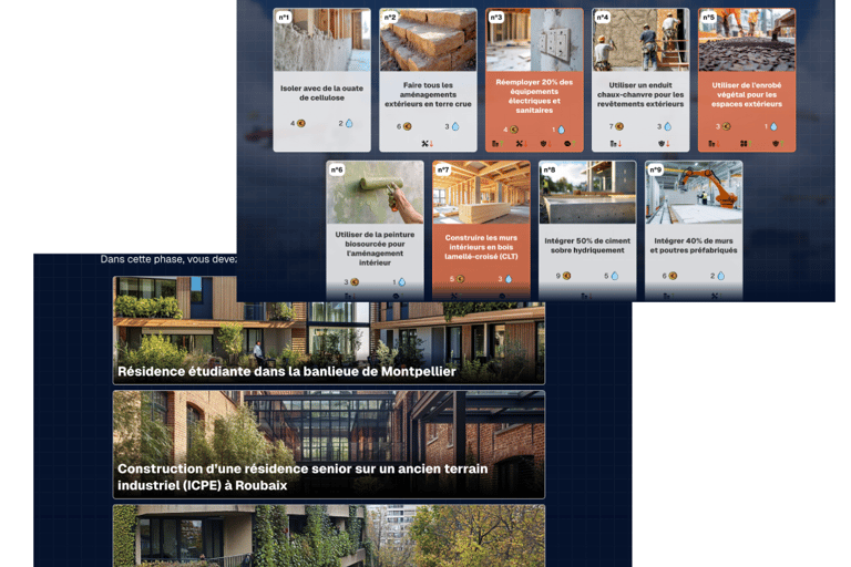 Un jeu sérieux permettant de suivre un projet de bâtiment de la phase d’élaboration à la phase d’exploitation, en minimisant son empreinte hydrique tout en respectant les contraintes budgétaires, environnementales et réglementaires.
